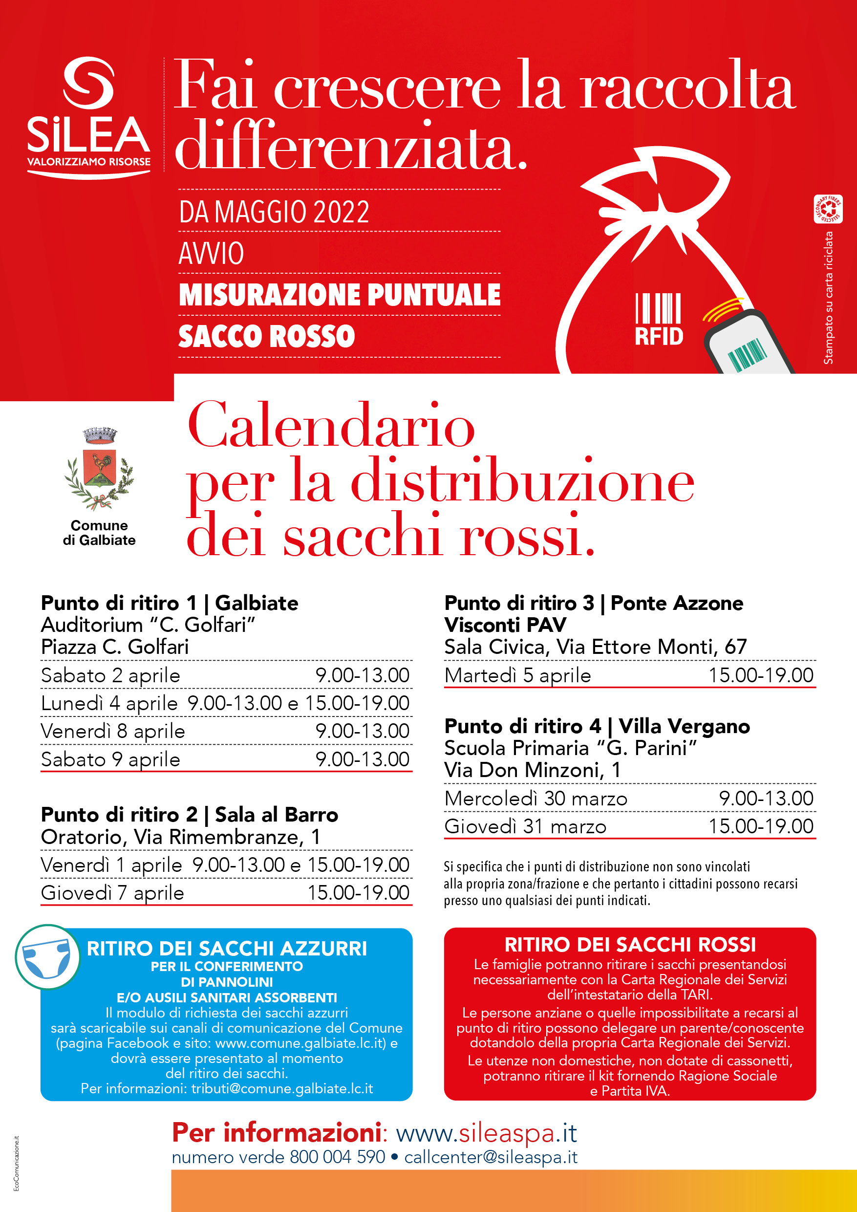 Gli utenti che non hanno ancora ritirato i sacchi rossi potranno farlo presso l'Ufficio Tributi negli orari di apertura al pubblico (lunedì, martedì, giovedì e sabato dalle 9.30 alle 12.15 e mercoledì dalle 15 alle 17)