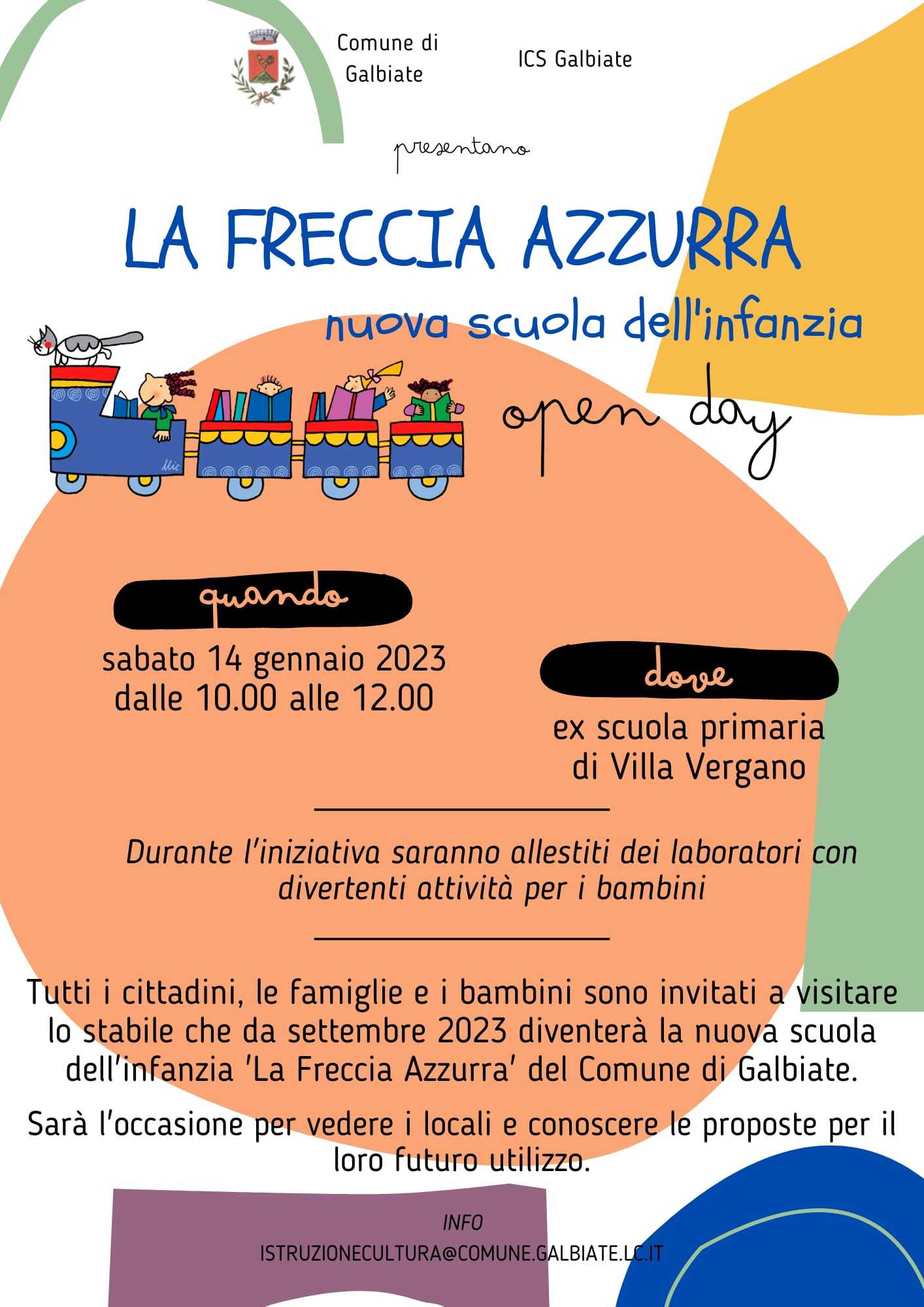 Tutti i cittadini, le famiglie e i bambini sono invitati sabato 14 gennaio dalle ore 10.00 alle 12.00 a visitare lo stabile che da settembre 2023 diventerà la nuova Scuola dell'Infanzia "La Freccia Azzurra".