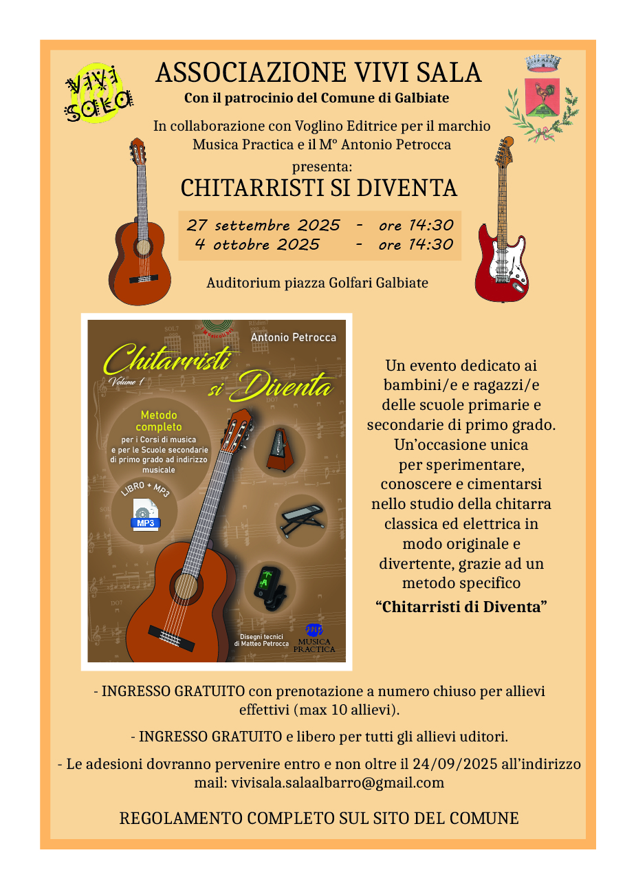 L'ASSOCIAZIONE VIVI SALA In collaborazione con Voglino Editrice per il marchio Musica Practica e il M° Antonio Petrocca presentano "CHITARRISTI si DIVENTA"