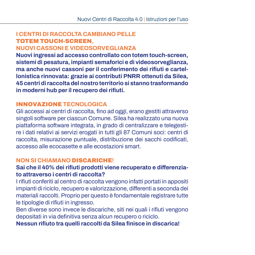 Per illustrare il funzionamento del nuovo sistema, nelle giornate iniziali di attivazione dei totem, Silea (la società pubblica che gestisce l’intero ciclo integrato dei rifiuti sul territorio) ha previsto la presenza di addetti che forniranno il supporto necessario all’utenza che, in ogni caso, potrà contare anche sull’assistenza dell’operatore in servizio.