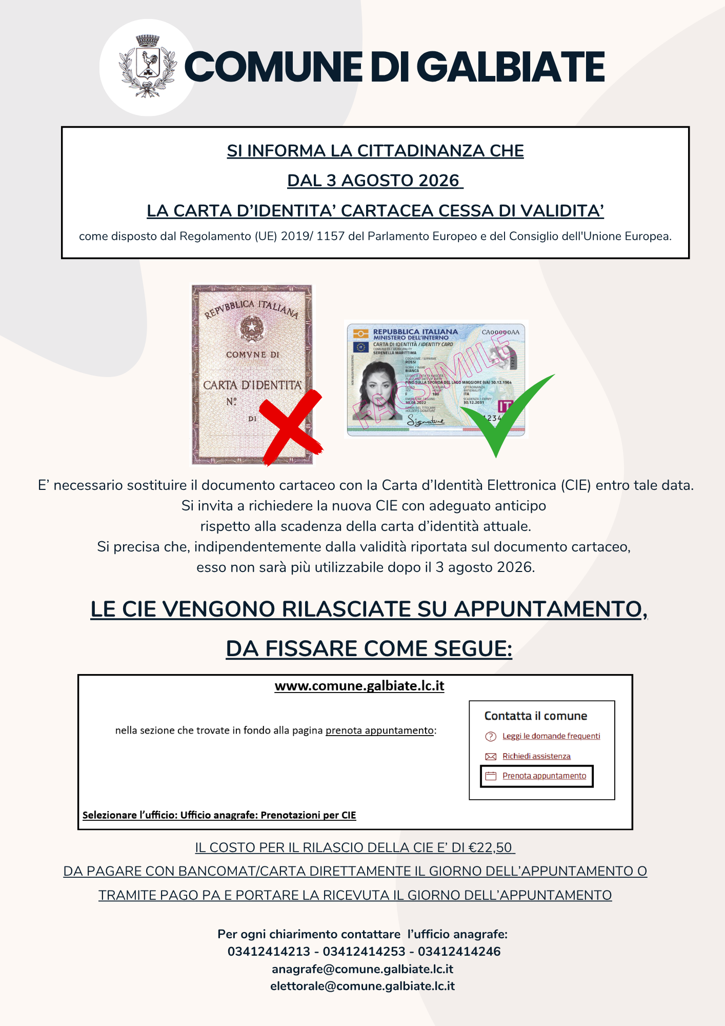 LE CIE VENGONO RILASCIATE SU APPUNTAMENTO, DA PRENDERE SUL SITO DEL COMUNE, COME DA LOCANDINA ALLEGATA.