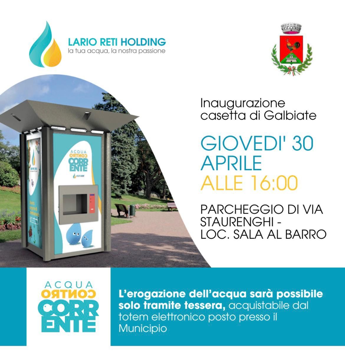 Giovedì 30 aprile alle ore 16.00 verrà inaugurata una nuova casetta dell’acqua, sita in via Staurenghi a Sala al Barro. La casetta è installata da Lario Reti Holding, che si è occupata di acquisto e installazione dell’impianto e si occuperà anche della sua gestione, coprendone interamente i costi anche per le manutenzioni ordinarie e straordinarie.